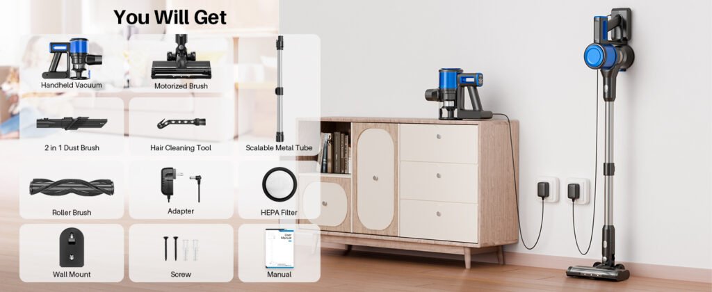 - Wall-Mount Storage: Keeps vacuum and attachments organized.