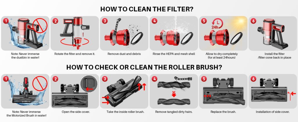 BSNAW Red Cordless Stick Vacuum Manual: How to Clean the Filter and Roller Brush