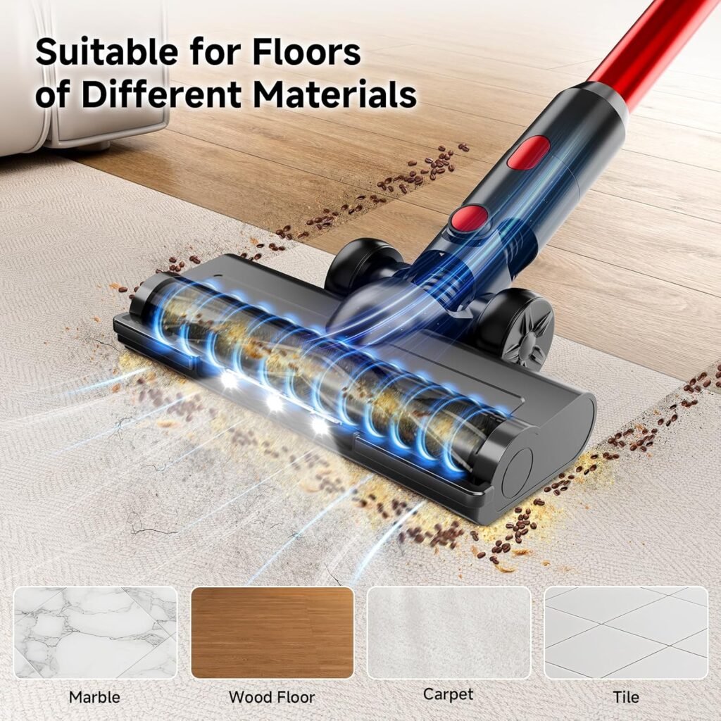 The BSNAW Red cordless stick vacuum delivers 35Kpa suction, a removable battery, and an LED smart display for clear control over runtime and power modes. With up to 45 minutes of cleaning time, an anti-tangle floor brush, and an 8-in-1 setup, it’s designed for everyday use across hard floors, carpets, and tight spaces.